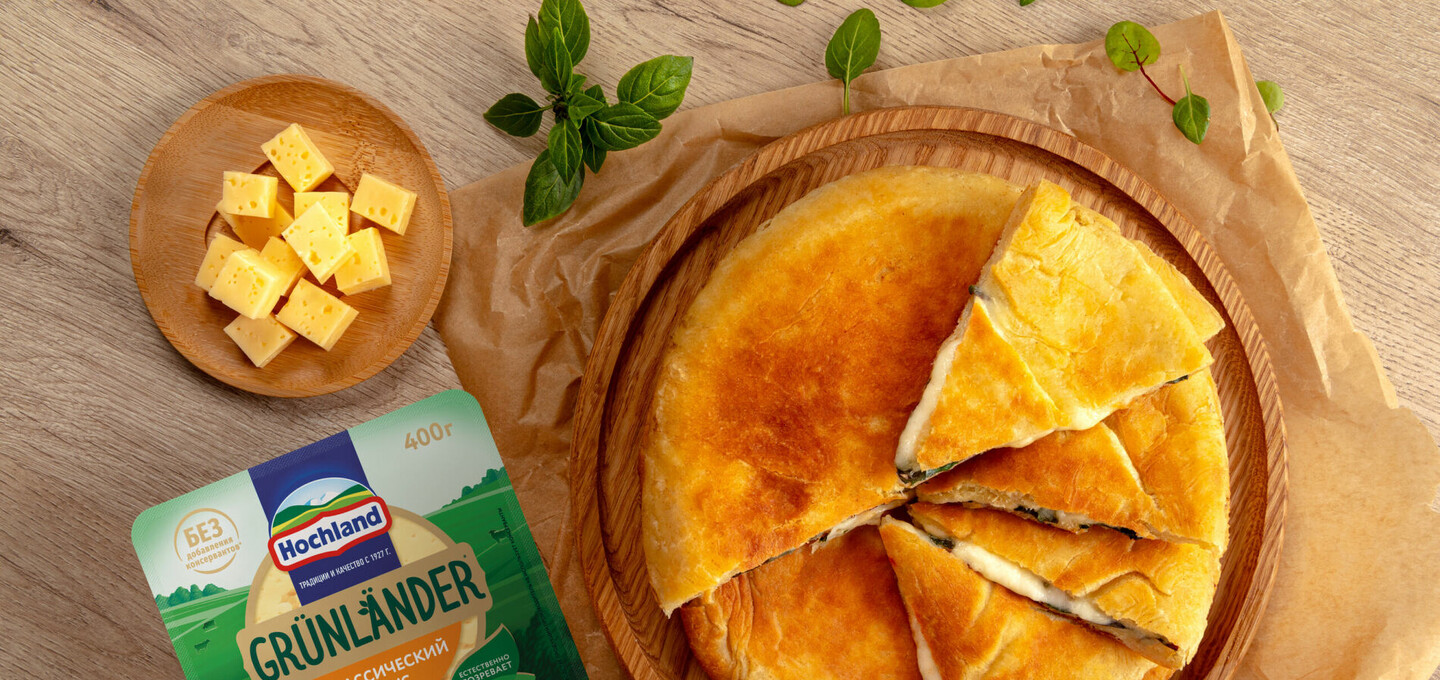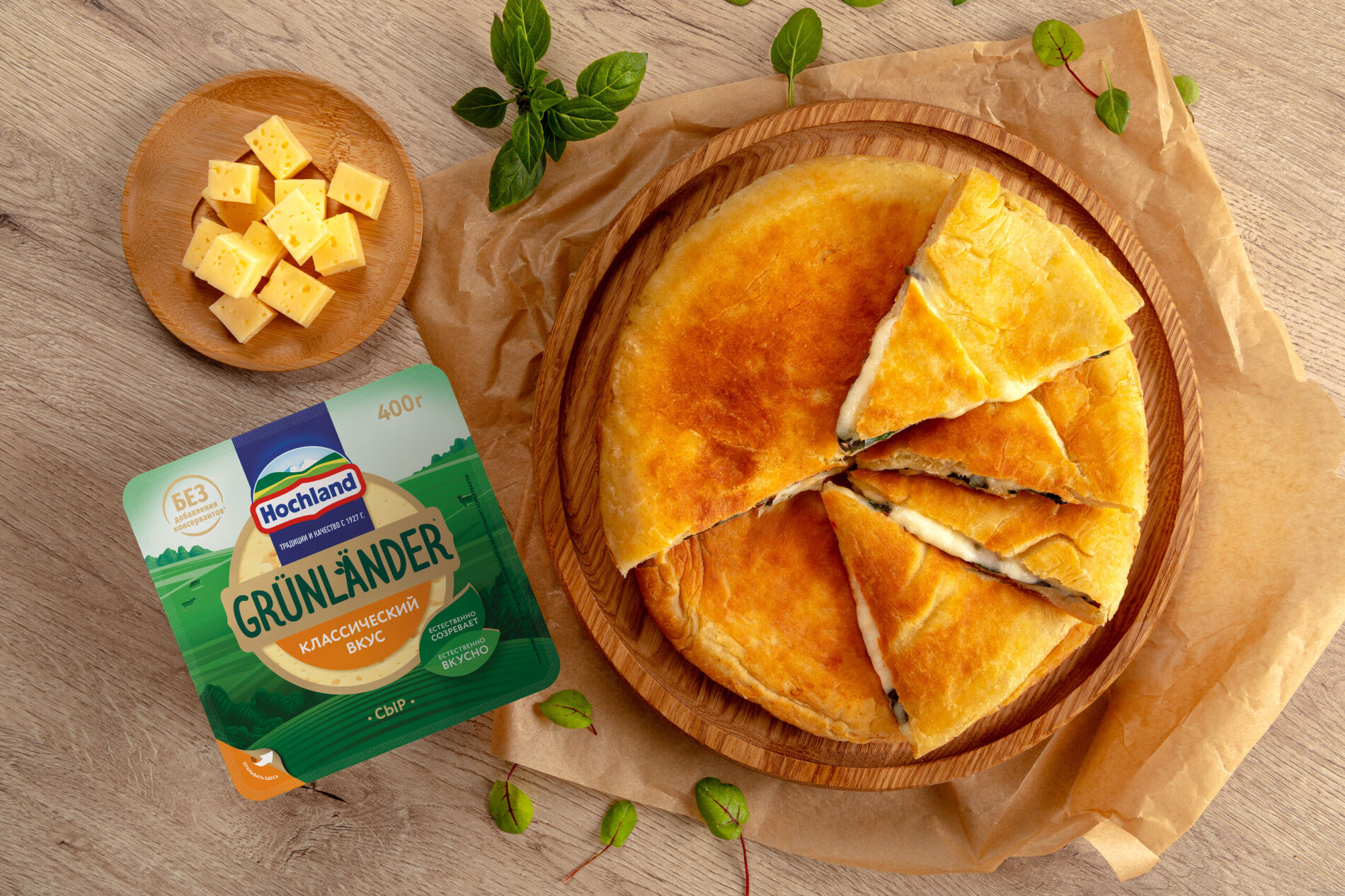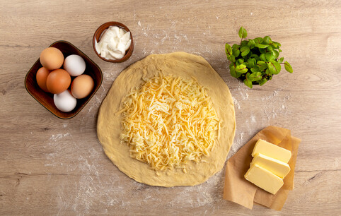 Чайную ложку соды разделите на 4 порции. Раскатайте тесто 4 раза и каждый раз добавляйте в него соду. Отправьте тесто в холодильник на 30 минут. Hochland Grünländer и сулугуни натрите на крупной терке и перемешайте.