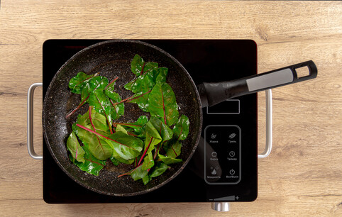 Разогрейте 20 г сливочного масла на сковороде. Затем добавьте молодые листья свеклы, посолите, поперчите и перемешайте с разогретым маслом (листья должны уменьшиться вразмере и впитать в себя все содержимое). Буквально 1-2 минуты, не больше.