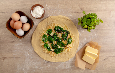 Тесто разделите на 4 части. Каждую раскатайте в лепешку, выложите в середину сыр. Распределите сверху припущенные молодые листья свеклы. Защипните и снова раскатайте. Толщина заготовки должна быть около 2 см.