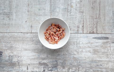 Разогрейте духовку до 180 °С. Нарежьте бекон небольшими кубиками. Выложите бекон на сковороду и поставьте на средний огонь, обжарьте на сильном огне, 3 мин.