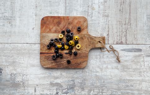 Разрежьте маслины и оливки пополам. Смешайте кукурузную крупу с мукой и разрыхлителем и солью.