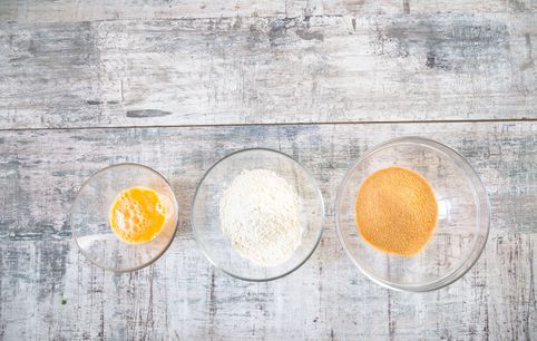 Взбейте в глубокой тарелке яйца с щепоткой соли и 1 ст. л. воды до однородности. Во вторую тарелку насыпьте муку, в третью сухари.