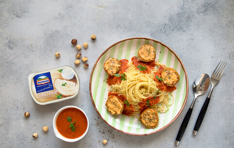 Готовые фрикадельки шумовкой, аккуратно, чтобы не проткнуть, выкладывайте на смятые бумажные полотенца – пусть стечет масло. Подавайте фрикадельки горячими, с томатным соусом и спагетти.