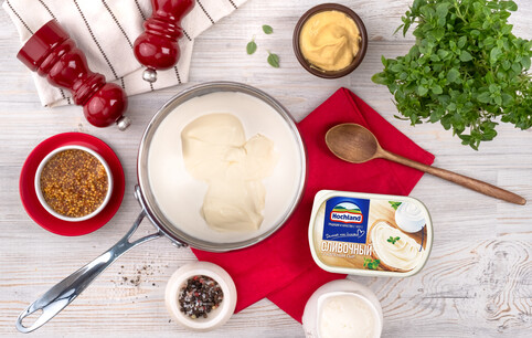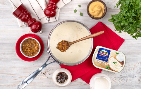 Добавьте в соус дижонскую горчицу и горчицу с зернышками, посолите и поперчите, хорошо размешайте. Проварите соус 1 мин. и снимите с огня. Подавайте к жареному мясу или стейкам.