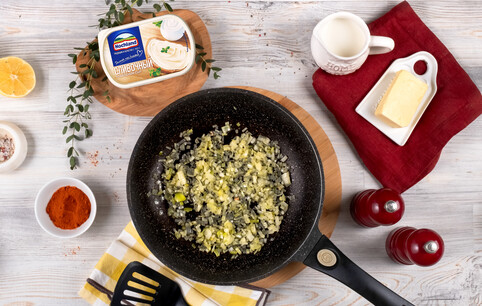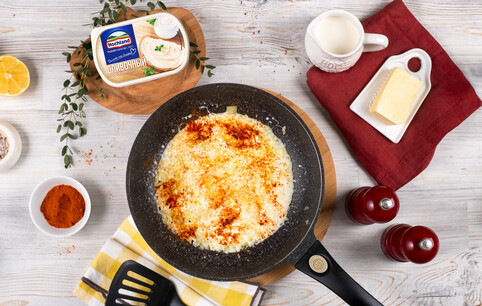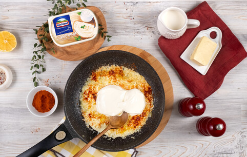 Всыпьте к луку паприку и, постоянно помешивая, готовьте 30 сек., затем влейте сливки.
