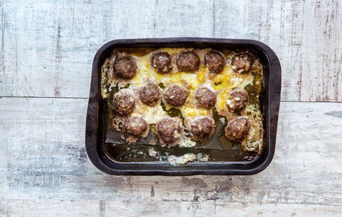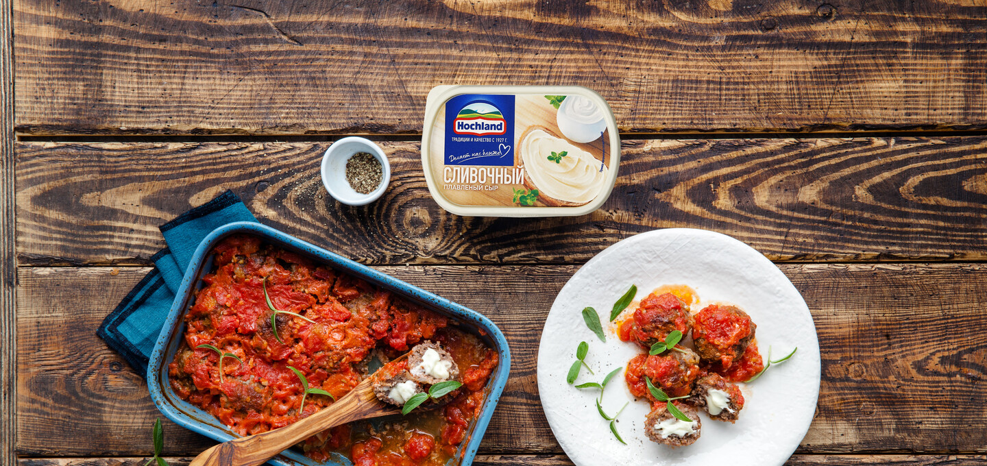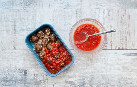 Убавьте температуру в духовке до 170 °С. Переложите фрикадельки вместе с выделившимся соком в глубокую форму для запекания, залейте томатным соусом и верните в духовку на 15 мин. Подавайте горячими.