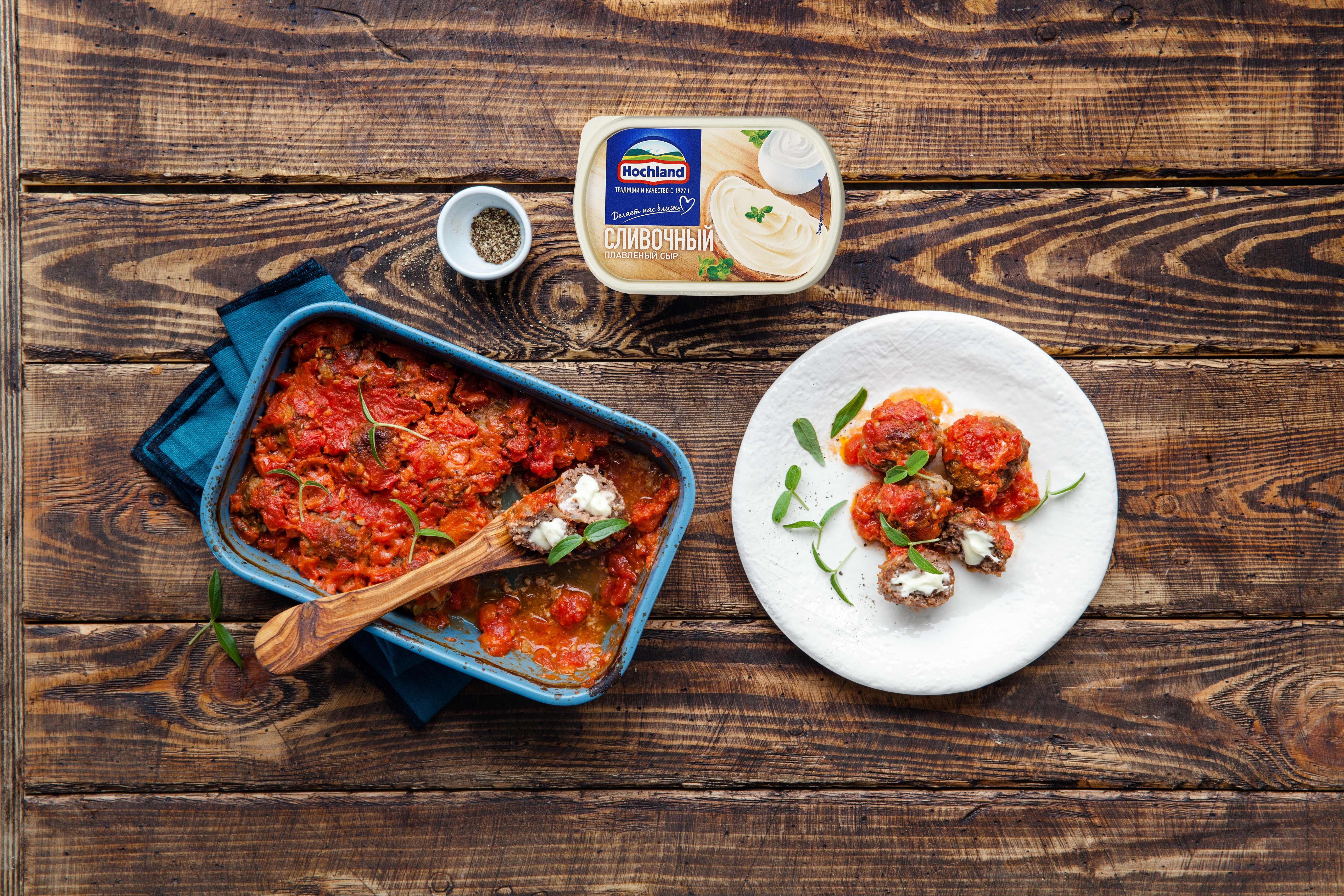 Застелите противень листом бумаги для выпечки. Смажьте руки оливковым маслом и скатайте из фарша ровные одинаковые фрикадельки размером с крупный грецкий орех с сыром внутри: сначала делайте из фарша лепешку, кладите внутрь пол-ложечки сыра, соединяйте края и аккуратно скатывайте в шарик.