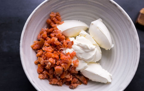 100 гр. лосося мелко нарезаем. Смешиваем с мягким творожным сыром и сметаной.