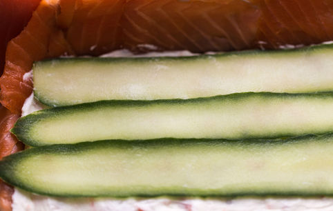 Сверху выкладываем половину творожной массы и разравниваем. Выкладываем поверх массы слайсы огурца в 1-2 слоя.