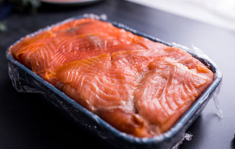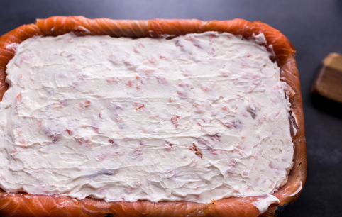 Накрываем оставшимися слайсами лосося и затягиваем пленкой.