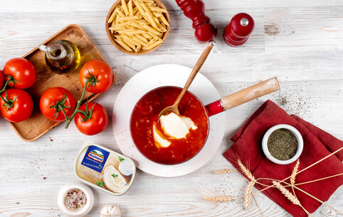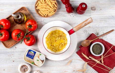 Помидоры очистите от кожицы, нарежьте небольшими кусочками и добавьте в кастрюлю к луку и чесноку. Доведите до кипения, приправьте сушеным базиликом и готовьте на медленном огне 15 мин.