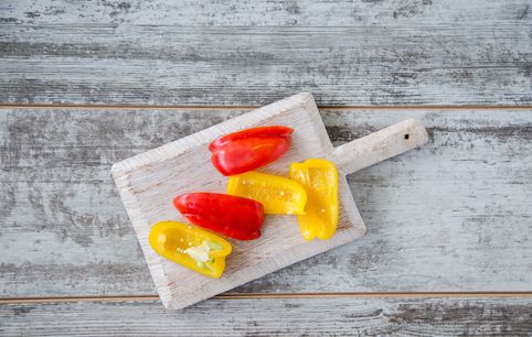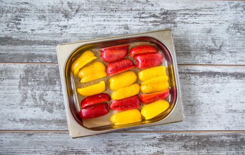 Разогрейте духовку с включенным грилем до 230 °С. Разрежьте перцы вдоль на 4–6 частей (в зависимости от размера). Смажьте кожицу маслом.