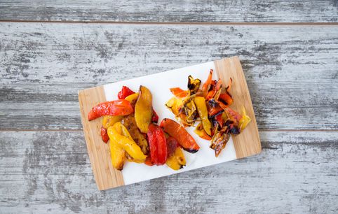 Выложите перцы кожицей вверх на застеленный фольгой противень. Поставьте под гриль и запекайте до почернения кожицы.