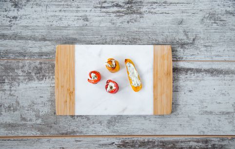 Смажьте начинкой каждую полоску запеченного перца и сверните в аккуратный рулетик. Выкладывайте рулетики на блюдо как пеньки. Поставьте в холодильник на 1–2 ч, затем подавайте.