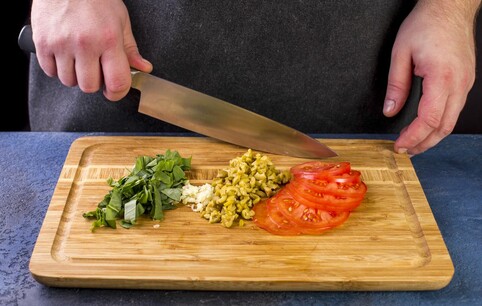 Базилик, оливки, чеснок и помидоры мелко порубите. Перемешайте, посолите, поперчите по вкусу.