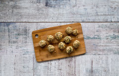 Тем временем порубите фундук с петрушкой как можно мельче. Надев одноразовые тонкие перчатки или постоянно смачивая руки в холодной воде, слепите из сырной массы шарики размером с небольшой грецкий орех и обваляйте в фундучно-петрушечной крошке.