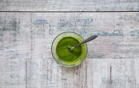 Для заправки измельчите всю зелень и чеснок с щепоткой соли в пасту – при помощи погружного блендера, в ступке или просто ножом. Смешайте с соком и цедрой лайма, а также с оливковым маслом.
