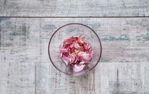Нарежьте сладкий лук перьями шириной 1 см, посыпьте солью и сахаром, полейте уксусом и перемешайте руками.