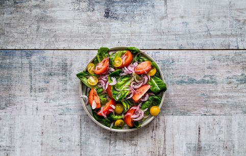 Разложите салатные листья на тарелки. Крупно нарежьте помидоры, черри разрежьте пополам, перемешайте помидоры с луком и выложите на салатные листья.