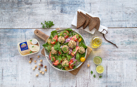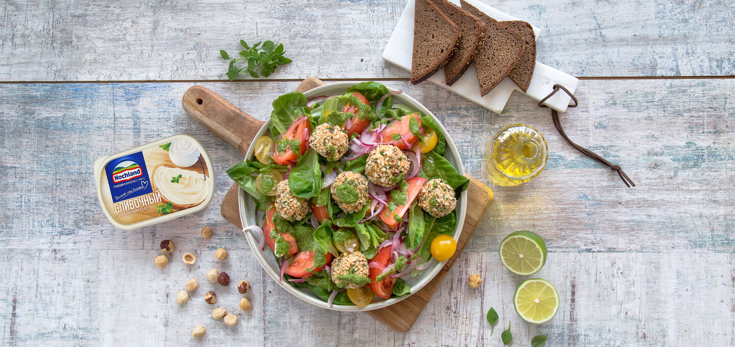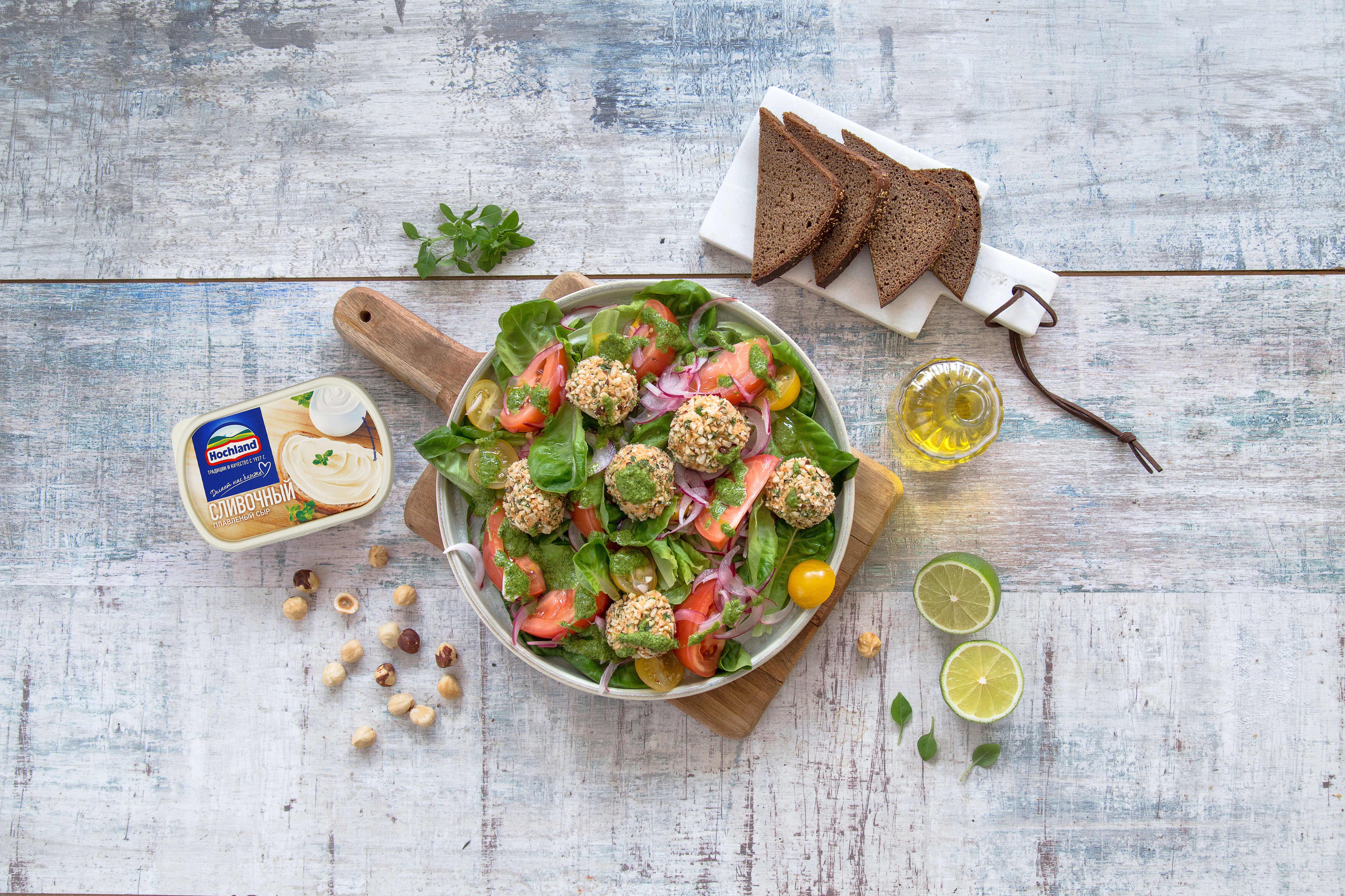 Сверху выложите сырные фрикадельки, полейте заправкой и подавайте с бородинским хлебом.